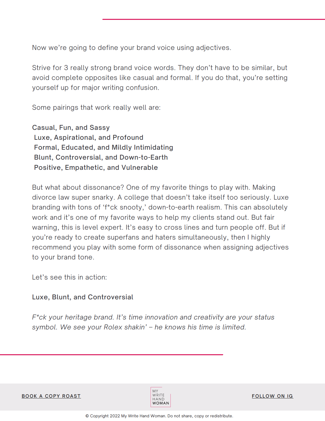 Hiring a copywriter is worth it (duh!) but it’s expensive. Working with me to craft your brand voice is a 4-figure investment.
